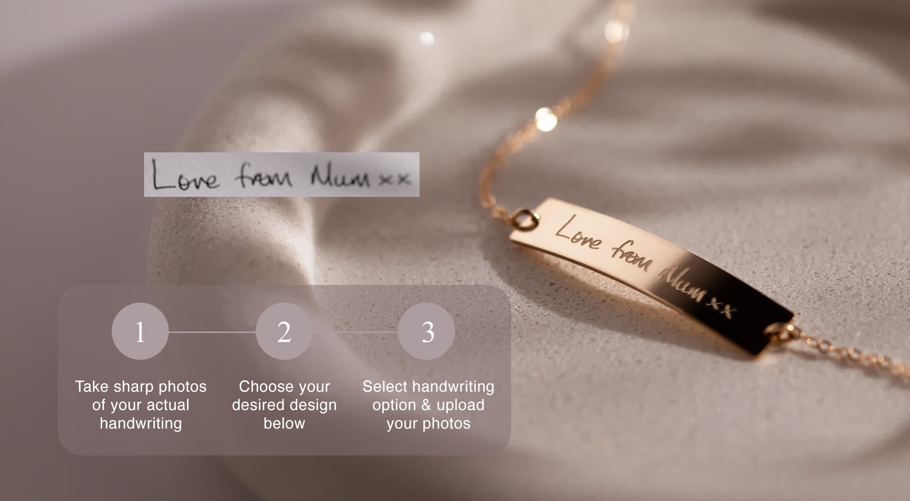 A truly personal way to preserve the words that matter most. Each piece is delicately engraved with your loved one’s actual handwriting, transforming a simple note, signature, or heartfelt message into a timeless keepsake. Carry their words with you, keeping them close forever.
